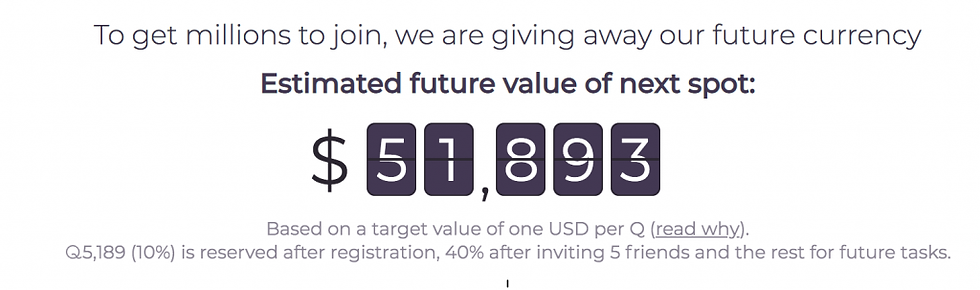 The rest of the plan seems naive enough that it might actually be sincere. Like an ICO, you get more “Q” tokens by joining early… all you have to do is give up your email address, and your friends’ email addresses, and promote Q on social media.
